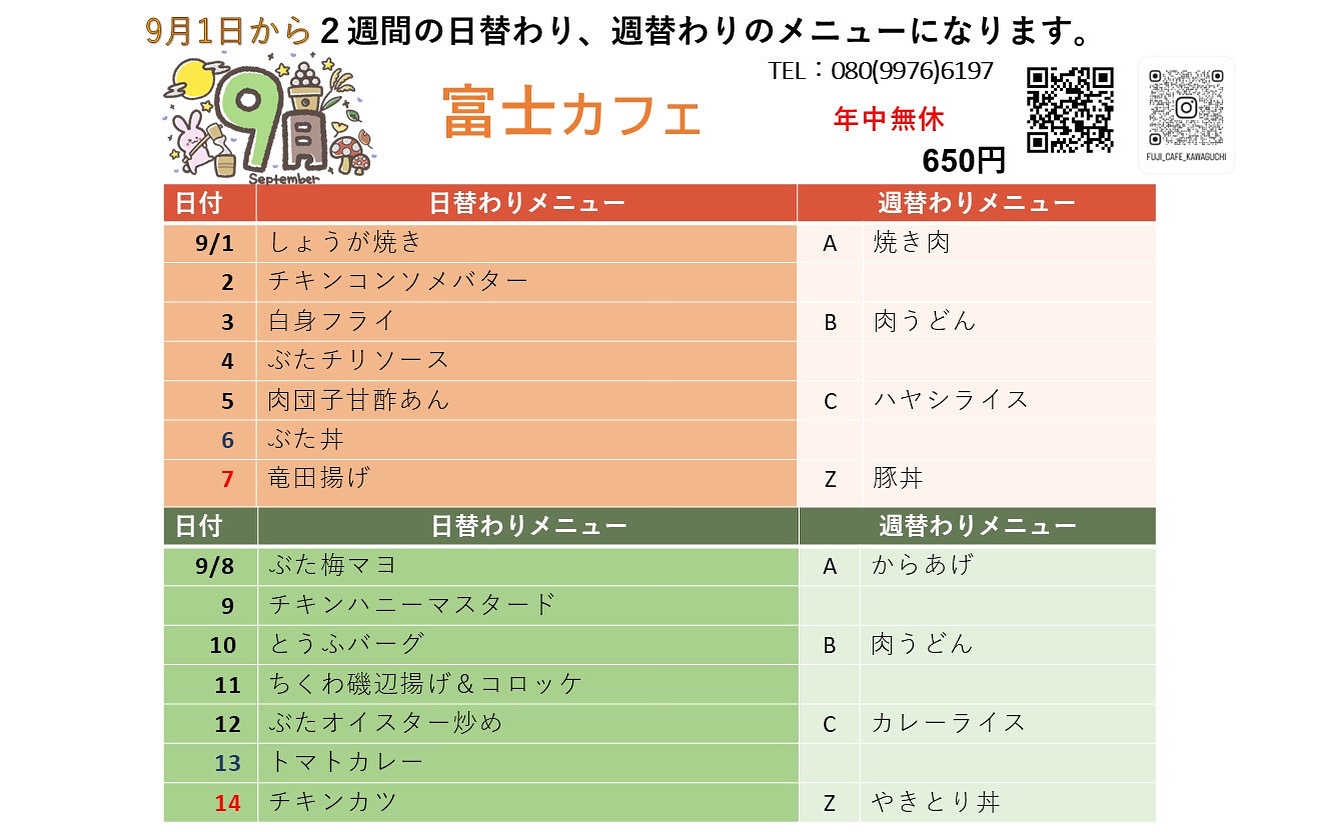9月1日~日替わり・週替わりメニュー